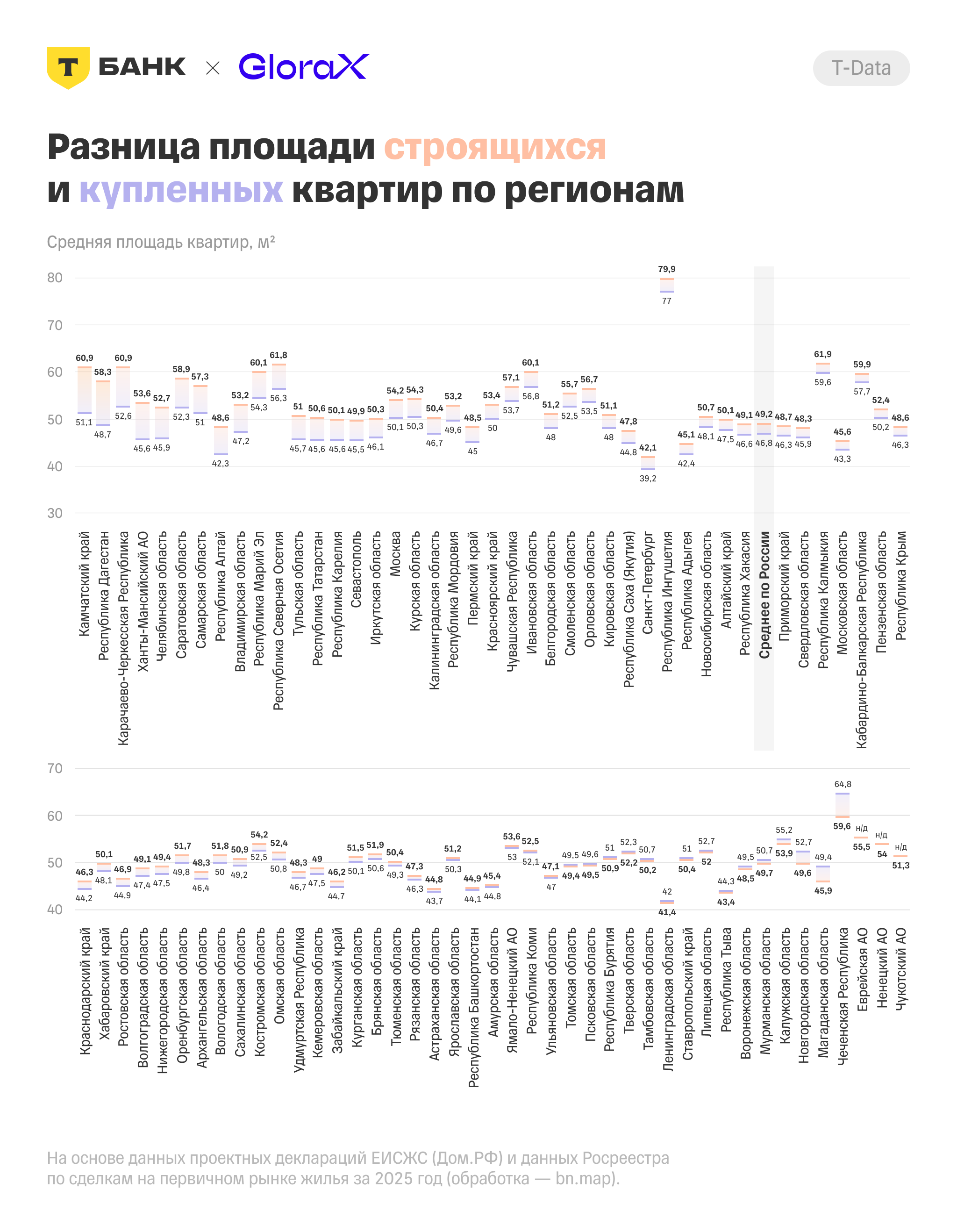 Есть и обратные примеры, но их значительно меньше. Так, в Магаданской, Новгородской областях и Чеченской Республике покупатели приобретали в 2025 году квартиры в среднем на 2—5 м² больше, чем средняя площадь всего строящегося в регионе жилья.