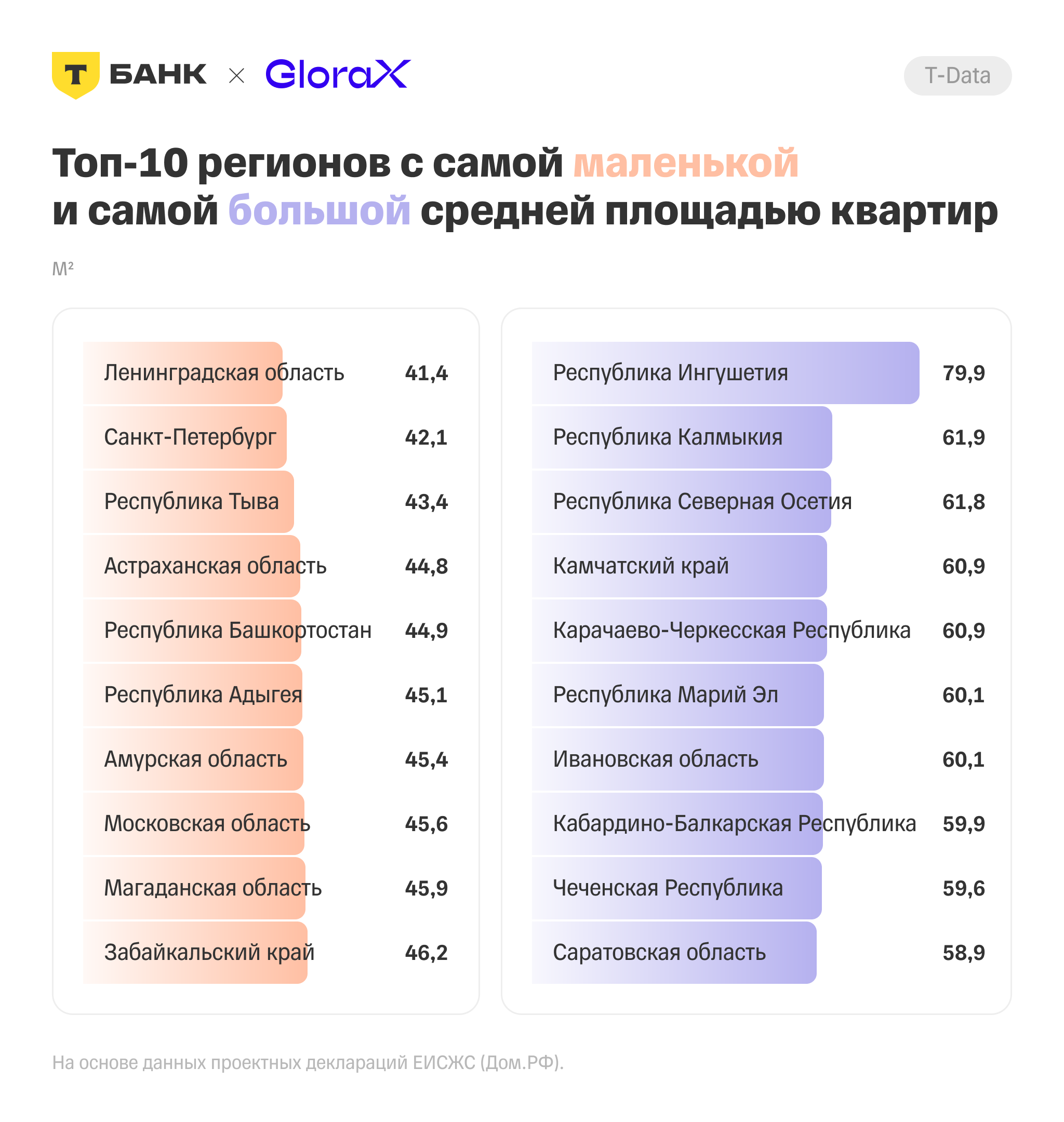 Максимальный средний метраж квартир зафиксирован в Республике Ингушетия — 79,9 м². К регионам с наиболее крупным строящимся жильем также относятся Республика Калмыкия (61,9 м²), Северная Осетия — Алания (61,8 м²), Камчатский край и Карачаево-Черкесская Республика (по 60,9 м²), Марий Эл и Ивановская область (по 60,1 м²).