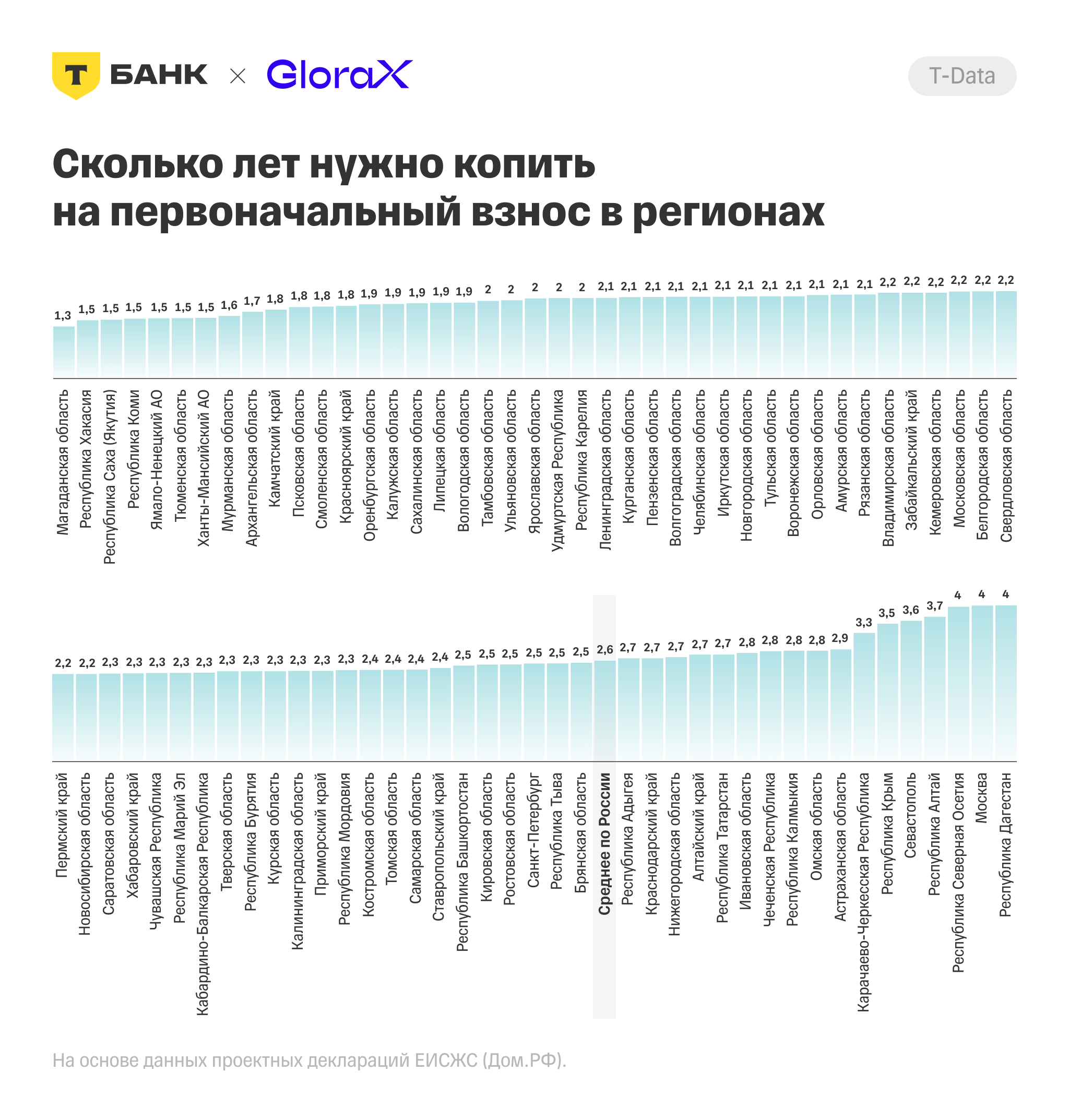 При этом общий разброс показателя по разным регионам значительный — от 1,3 до 4 лет. Минимальный срок накопления зафиксирован в Магаданской области — 1,3 года. К числу регионов, где накопление первоначального взноса занимает около 1,5 года или меньше, также относятся Ханты-Мансийский автономный округ — Югра, Тюменская область, Ямало-Ненецкий автономный округ, Республика Коми, Саха (Якутия) и Хакасия. В этих субъектах относительно высокий уровень официальных доходов позволяет быстрее формировать первоначальный взнос даже при не самых низких ценах на жилье.