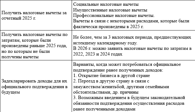 Осталось два месяца до завершения «декларационной компании 2026» по НДФЛ. В соответствии с Налоговым кодексом РФ (далее НК РФ) налоговая декларация по НДФЛ (далее Декларация) представляется не позднее 30 апреля года, следующего за истекшим налоговым периодом. То есть по результатам 2025 г. налоговую декларацию следует подать до 30 апреля 2026 г. Подача налоговой декларации является не только обязанностью, но и правом налогоплательщика. В пункте 2 статьи 229 НК РФ указано, что лица, на которых не возложена обязанность подавать налоговую декларацию, вправе представить такую декларацию в налоговый орган по месту жительства в любое время по окончании налогового периода. Кроме того, в п. 4 статьи 80 НК РФ четко прописано, что налоговый орган не вправе отказать в принятии налоговой декларации, представленной налогоплательщиков по установленной форме. По мнению Мельниковой Н.П., профессора кафедры налогов и налогового администрирования Финансового университета при Правительстве РФ, воспользоваться таким правом целесообразно в следующих случаях (таблица).