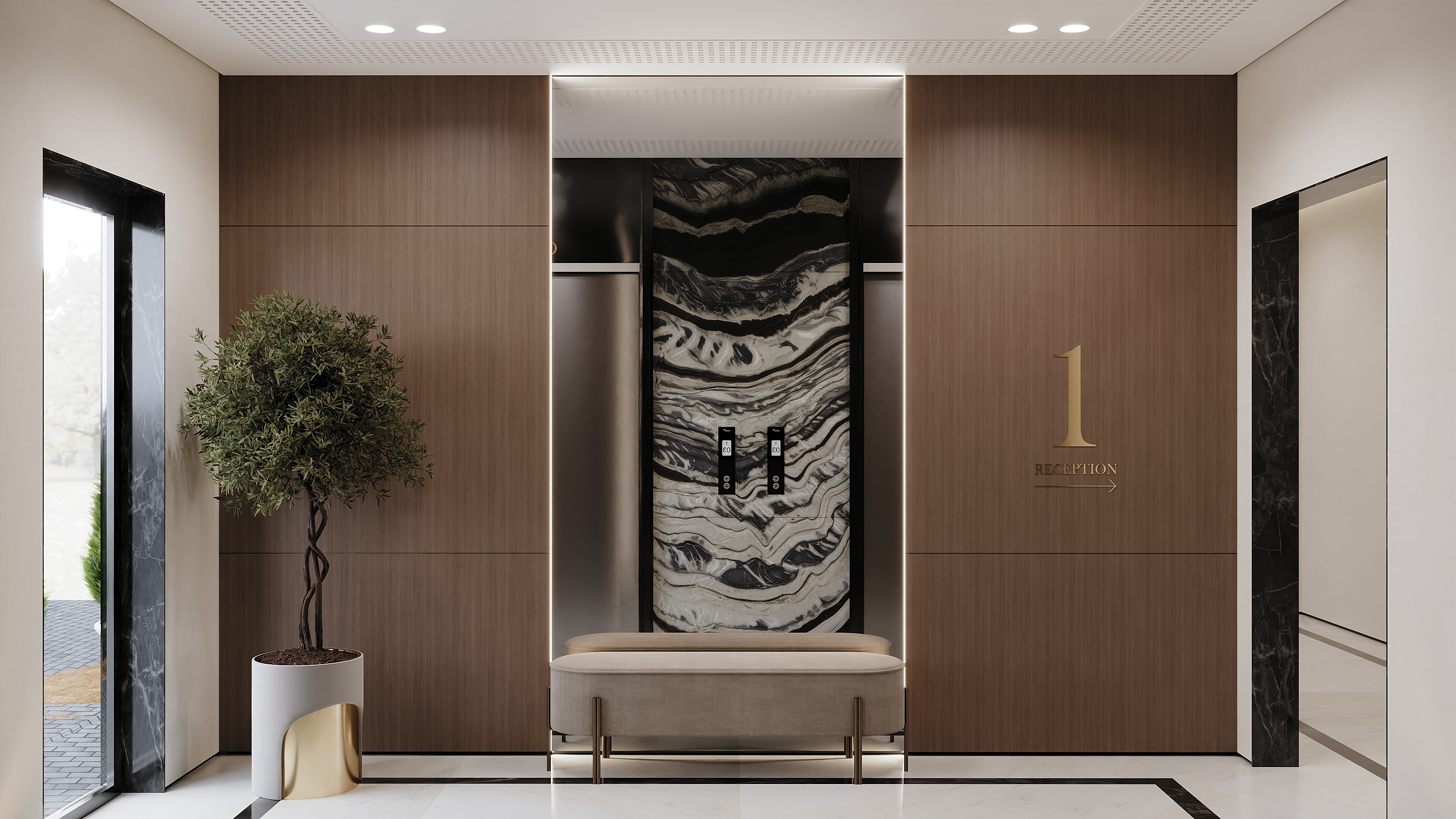 Для отделки пола и стен межквартирных и лифтовых холлов во всех трех секциях был выбран сорт Royal Cliff – поистине королевский мрамор, который обладает глубокой, многослойной молочно-кремовой текстурой с тонким рисунком в виде золотистых прожилок и мягких серых переливов. Цветовая гамма этого камня может варьироваться от белых до глубоких бежевых оттенков, что придаёт ему величественный вид. Усиливает эффект многоступенчатая обработка, благодаря которой поверхность камня не только приобретает изысканный глянцевый блеск, но и становится более прочной и долговечной.