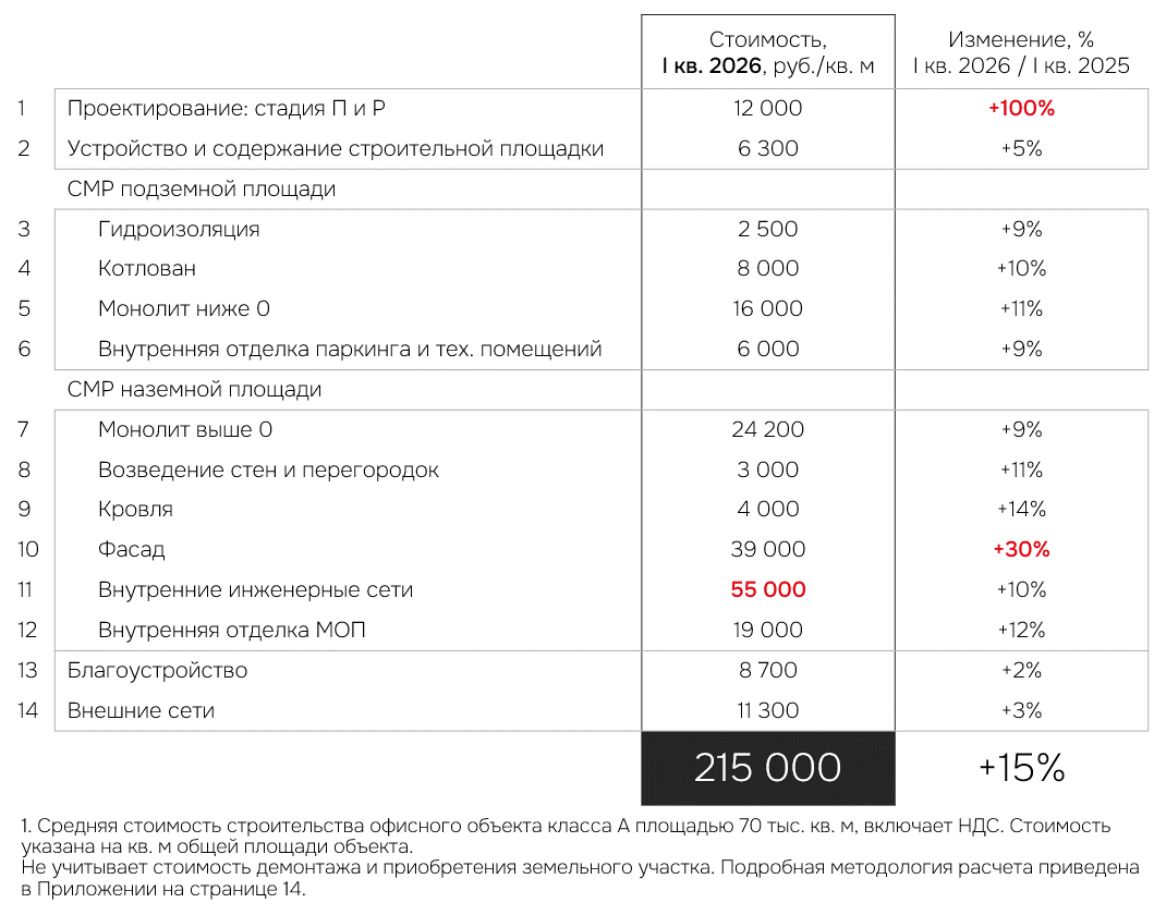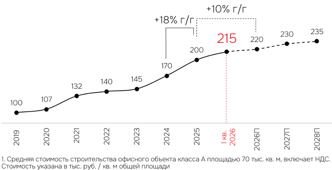По данным консалтинговой компании IBC Real Estate и аналитического центра STONE, по итогам I квартала 2026 года стоимость строительства офисного объекта класса А составила 215 тыс. руб./кв. м общей площади здания с учетом НДС, увеличившись на 15% г/г. При пересчете на полезную показатель достигает 380 тыс. руб. / кв. м. Самый высокий рост продемонстрировали затраты на проектирование и фасады, которые увеличились на 100% и 30% год к году соответственно.