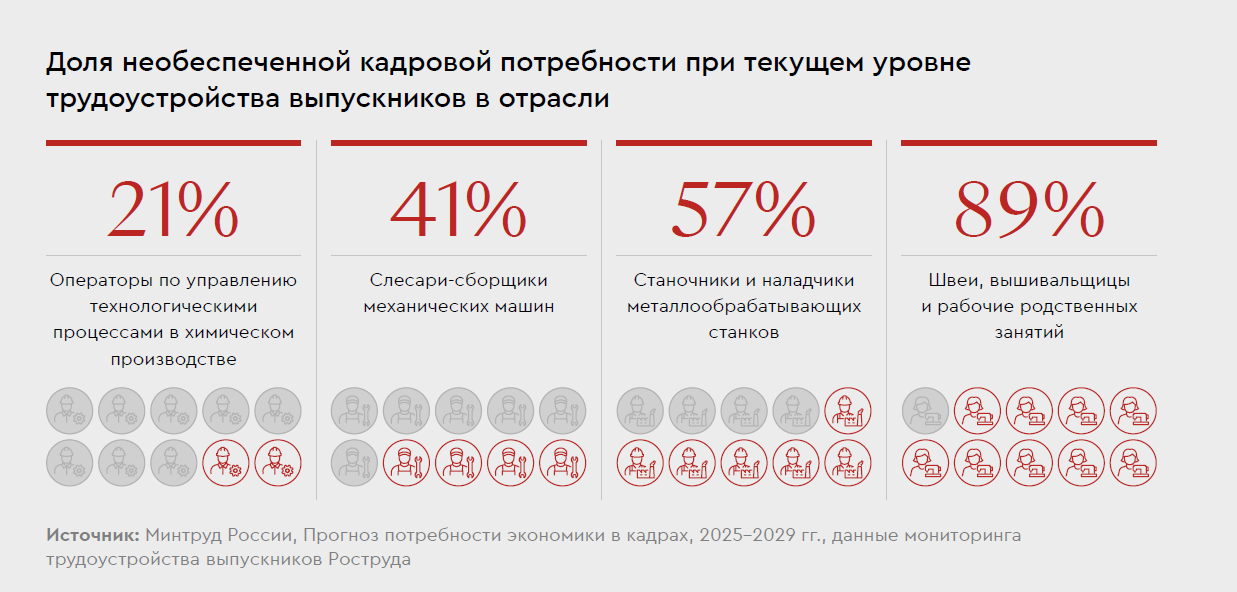 По оценкам экспертов, отрасль испытывает наибольшую потребность в замещении кадров среди всех секторов экономики — к 2029 г. потребуется 1,6 млн человек. При этом 1,4 млн человек необходимо лишь для восполнения кадрового баланса в связи с выбытием работников на пенсию, что обусловлено высоким средним возрастом занятых и низким уровнем притока новых специалистов в предыдущие периоды. Дополнительно 203 тыс. человек потребуются для покрытия спроса, связанного с созданием новых рабочих мест вследствие расширения производства, амбициозными целями по импортозамещению и технологическому суверенитету.