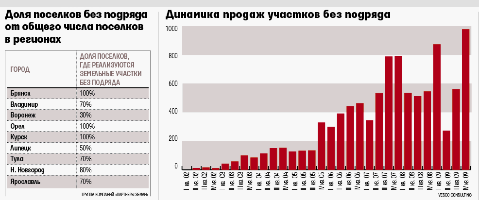Участки без обязательного подряда на строительство – это единственный формат, продажи которого продолжают уверенно расти в посткризисный период. По сравнению с I кварталом 2009 г. во II квартале продажи увеличились в 1,7 раза, отмечает Картавцева. Минимальная стоимость сотки в таких проектах составляет 10 000 руб., коммуникации оплачиваются отдельно. Например, так действует компания «Финансы и недвижимость»: «Участки у деревни Константиново», «Участки у деревни Чаплыгино» (Новорязанское шоссе, 65 км от МКАД).
