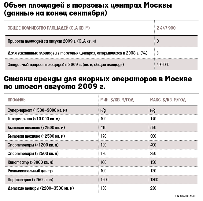 По данным Knight Frank, за первое полугодие текущего года ставки аренды снизились на 40–60% по сравнению с первым полугодием 2008 г. Падали и обороты розничной торговли - по данным Москомстата, за I полугодие 2009 г. объем оборота розницы составил почти 1,197 млрд руб., что на 5,5% меньше, чем за тот же период 2008 г.