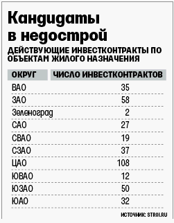 В октябре мэр Москвы одобрил в соответствующем постановлении инициативу «Интеко» о расторжении инвестконтракта 2004 г. на право застройки 76,5 га по Международному шоссе и 148,6 га по Ленинградскому шоссе. Вдоль Ленинградки планировалось построить более 1 млн кв. м, в основном жилья. На сайте префектуры САО висит список из 24 инвестконтрактов «с истекшими сроками действия, по которым строительство объектов не завершено». Однако инвесторам, строящим жилые дома, как правило, дается возможность их завершить.