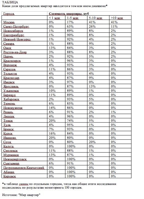 Но так или иначе квартиру за 1 млн руб. на российском рынке найти непросто. К такому выводу пришли специалисты федерального портала «Мир квартир», проанализировав предложение вторичного жилья в 150 городах Российской Федерации. Таким образом, до вожделенной стоимости «квадрата» на уровне 30 000 руб. (а именно при этом условии цена однокомнатной квартиры площадью 30 кв. м не превысит 1 млн руб.) еще далеко не только столичному, но и региональному рынку недвижимости.