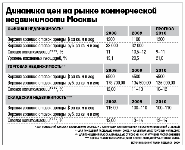 По данным аналитиков Knight Frank, к концу 2009 г. совокупное предложение офисов составит 10,4 млн кв. м, торговых площадей – почти 6,343 млн кв. м (открытие ряда торгцентров перенесено с 2009-го на 2010 г.), складов – около 9,6 млн кв. м. В следующем году на рынке может появиться около 270 000 кв. м качественных складов, но, по словам Антонова, все будет зависеть от запросов потенциальных клиентов.
