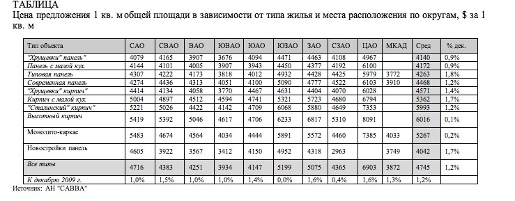 По данным агентства недвижимости «Савва», в январе 2010 г. средняя цена предложения в Москве составила $4745 за 1 кв. м (+1,2% к декабрю 2009 г.). Рублевые цены за месяц выросли на полпроцента до 144 800 руб. за 1 кв. м, а объем предложений за тот же период уменьшился на 12,9% и составил 13 293 квартиры. Единственный сегмент, где цены за месяц снизились на 0,4%, - бизнес-класс. Довольно долгий срок экспозиции квартир в январе - 95 дней - аналитики компании объясняют длительными новогодними праздниками.