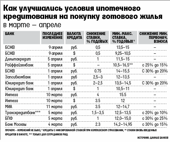 С начала апреля условия жилищных кредитов улучшили «Юникредит банк», «Банк сосьете женераль восток» (БСЖВ), Запсибкомбанк, «Дельтакредит», Райффайзенбанк. Первые четыре банка снизили ставки по рублевой ипотеке на 0,75–3% годовых (см. таблицу). БСЖВ и «Юникредит банк» уменьшили размер минимального первоначального взноса с 30% до 20% стоимости жилья, а Райффайзенбанк – с 25% до 15% по кредиту на готовое жилье, а также возобновил кредитование с подтверждением дохода заемщика справкой по форме банка. Сегодня БСЖВ повторно снижает ставки по кредитам на готовое жилье еще на полпункта.