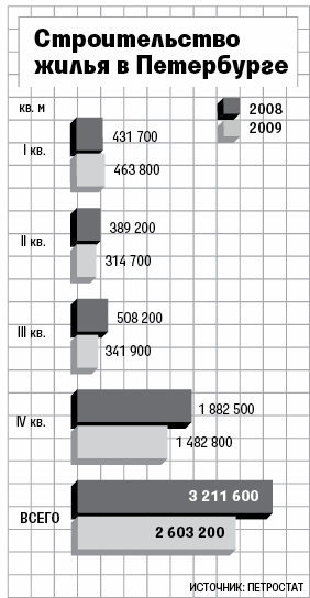 Прошлый год был не самым удачным для строителей и девелоперов, первые восемь месяцев новые квартиры почти не продавались, небольшое оживление на рынке началось только в сентябре, вспоминает гендиректор «Ленстройтреста» Александр Лелин. Из-за замедления темпов строительства примерно на 40% просел рынок стройматериалов на Северо-Западе, в первую очередь в Петербурге, добавляет гендиректор консультационной фирмы «Решение» Александр Батушанский. Средние цены на жилье в Петербурге снизились за 2009 г. на 14%, отмечается в аналитическом отчете «КИТ финанс».
