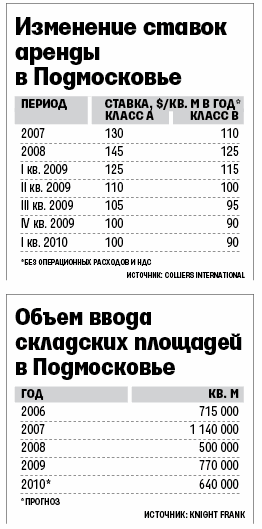 В I квартале 2010 г. было куплено или арендовано 269 500 кв. м складских помещений, что втрое больше, чем за аналогичный период 2009 г. Тогда их было 90 000 кв. м, говорится в отчете консалтинговой компании Jones Lang LaSalle (JLL). У брокеров Knight Frank цифры несколько другие: 170 000 против 57 000 кв. м. У консалтинговой компании Core Group это соотношение равно 200 000 к 75 000 кв. м.