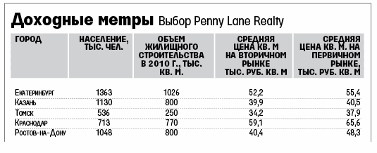 Топ-5 возглавил Екатеринбург, за ним следуют Казань, Томск, Краснодар, Ростов-на-Дону. При составлении рейтинга Penny Lane Realty учитывала целый ряд параметров, рассказывает представитель компании. В частности, аналитики сравнивали, сколько квадратных метров жилья в городе строится на одного жителя, – нормальным темпом считается 1 кв. м на жителя в год. По этому показателю лидируют Екатеринбург и Казань (см. табл.). Следующий критерий – деятельность градообразующих предприятий и темпы выхода экономики региона из кризиса. Это определяет внутренний платежеспособный спрос в городе. Екатеринбург – лидер по этому критерию: рост производства обрабатывающих предприятий города в 2010 г. составил 23,5% (по России в целом – 5,2%).