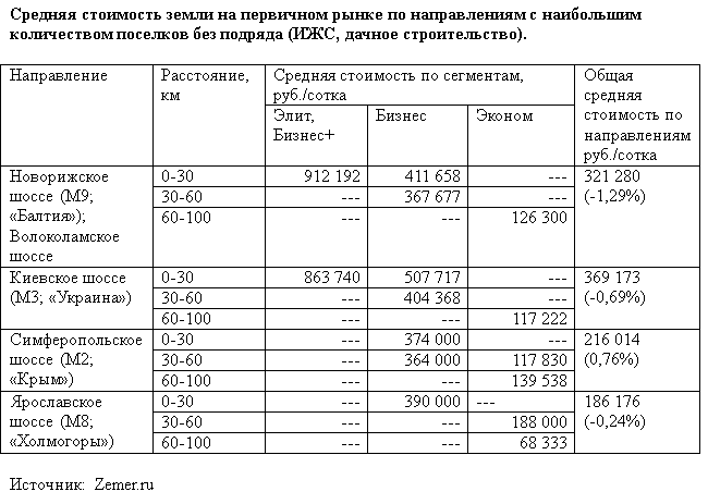 Цены на участки без подряда в феврале 2011 г. оказались самыми низкими за весь кризисный период, начиная с 2009 г., посчитал земельный портал Zemer.ru. В первые три квартала 2010 г. средняя стоимость сотки земли в поселках без подряда составляла 264 000-268 000 руб. По итогам февраля 2011 г. средняя цена упала до 260 186 руб. за сотку. Снижение началось уже с ноября прошлого года.