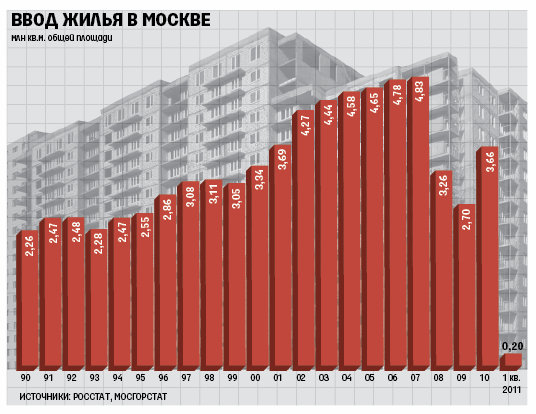 За I квартал 2011 г. в Москве построено только 10% от запланированного на 2011 г. объема жилья – и чуть ли не вполовину меньше, чем в прошлом году. Власти объясняют падение тем, что стали строже оценивать качество сдаваемых домов, и надеются, что строители наверстают упущенное. Строители и риэлторы сомневаютсяВ Москве в I квартале 2011 г. введено 200 000 кв. м новостроек, сообщил аналитический центр компании «Гдеэтотдом.ру» со ссылкой на данные Мосгорстата. Это на 40% меньше, чем годом ранее, при том что за весь 2010 год из-за кризиса было введено 1,77 млн кв. м жилья – на треть меньше, чем в 2009 г. В этом году, как рассказывал «Ведомостям» руководитель стройкомплекса Москвы Марат Хуснуллин, планируется ввести около 2 млн кв. м. Снижение показателей по вводу в начале года он объяснял ужесточившимися требованиями к строителям: «Мы перестали заниматься сдачей жилья к определенному времени и запретили сдавать его с недоделками». Мэр города Сергей Собянин поручил не гнаться за цифрами, а строить дома «качественно и реально». В итоге старая система разрушена, а новая еще не построена, говорит о ситуации в строительном комплексе Москвы руководитель аналитического центра «Гдеэтотдом.ру» Александр Пыпин. В правительстве Москвы рассчитывают, что строители учтут новые требования и планы ввода жилья в эксплуатацию по итогам года могут быть даже перевыполнены, говорит чиновник администрации.