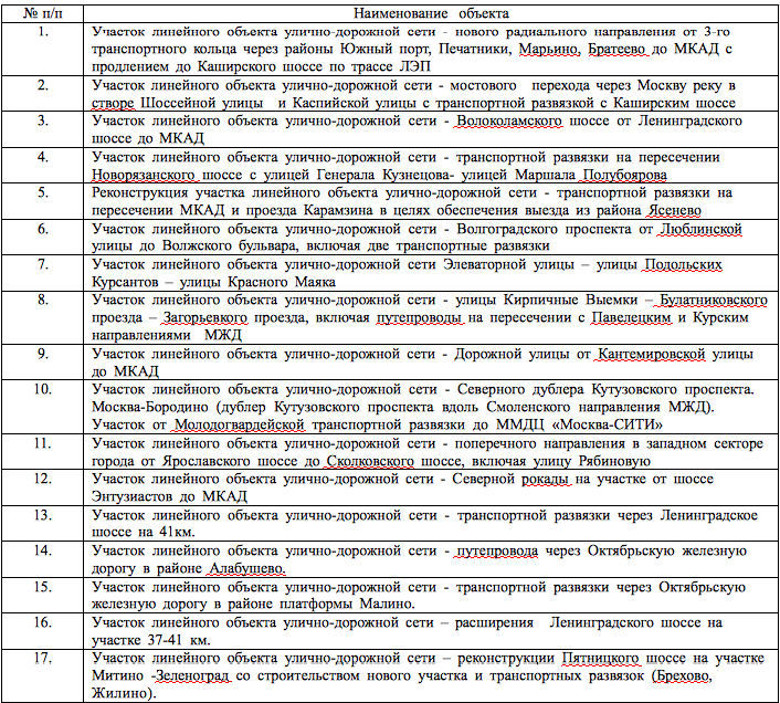 По реконструкции Рублевского, Щелковского, Алтуфьевского, Дмитровского, Ленинградского, Ярославского шоссе, проспекта Вернадского, Мичуринского проспекта и Профсоюзной улицы объявлены торги на генеральную проектную организацию (итоги будут в ноябре 2011 г). Технические предложения по реконструкции автомобильных магистралей: Севастопольский проспект, Волоколамское шоссе, Садовое кольцо проработаны на транспортной комиссии Москомархитектуры, документы готовятся для передачи в департамент строительства города Москвы. Конкурс на проектные работы планируется объявить в ноябре 2011 г.