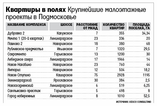 Сейчас в Подмосковье реализуется 36 малоэтажных проектов (данные Vesco Consulting). В 2009 г. их было не более пяти (информация MR Group). Только в 2011 г. под Москвой начато пять комплексов и открыты новые очереди еще в двух. Vesco Consulting знает еще о пяти малоэтажных проектах общей площадью более 0,5 млн кв. м, о которых заявят в 2012–2013 гг.
