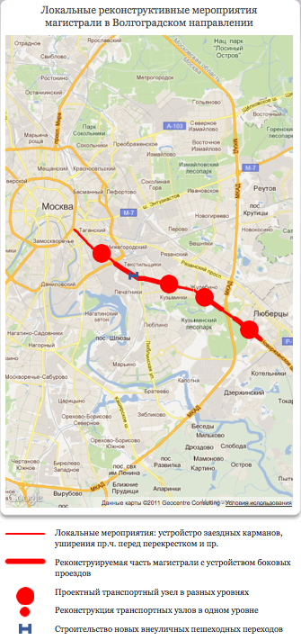 Волгоградский проспект будет реконструироваться от Садового кольца до ул. Маршала Полубоярова, протяженность реконструируемого участка составит 13,5 км. Также планируется строительство 2 развязок: на пересечении с Люблинской ул. (тоннель по Люблинской ул.) и на пересечении с Волжским бульваром (2 эстакады для левых поворотов). Кроме того расширится проезжая часть Волгоградского направления общей длиной 1 км до 8 полос; построят боковые проезды с обеих сторон шириной 7-10,5 м длиной 2,4 км и 11 заездных карманов. В результате на двух перекрестках будет отменено светофорное регулирование в связи со строительством развязок, а на третьем – пересечении с Ташкентской ул. – перегрузка будет снята благодаря строительству новых участков для поворотных движений.
