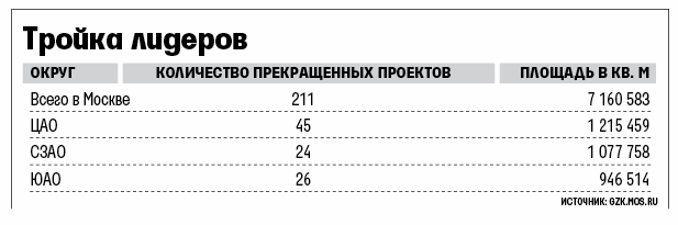 Став мэром, Собянин в ноябре 2010 г. создал и возглавил градостроительно-земельную комиссию, которая должна была рассмотреть к 30 сентября 2011 г. все 1175 действующих контрактов, но не успела (ревизия еще продолжается). Всего прекращено 211 инвестиционных проектов, предусматривавших строительство 7,16 млн кв. м различной недвижимости, указано на сайте. Из них 107 объектов – это точечная застройка. Больше всего проектов отменено в ЦАО – 45 на 1,2 млн кв. м, меньше всего – пять проектов – в Зеленограде, на 25 838 кв. м (см. врез). По каждому проекту на сайте есть информация, что предполагалось построить, какова площадь объекта, кто инвестор, есть ли документы об отмене решения, размещается карта местности и т. д.