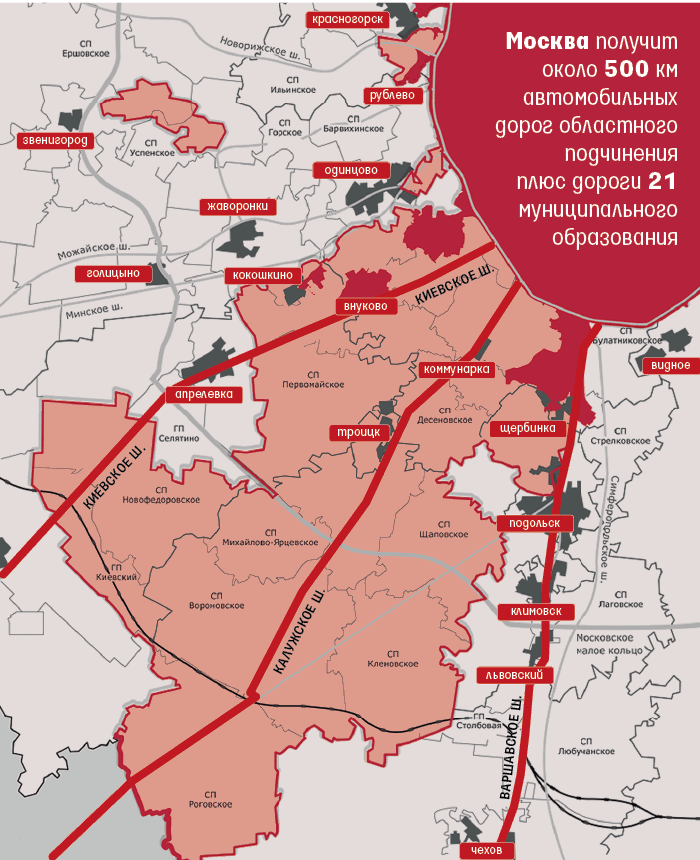 Городское правительство, наоборот, активно говорит о федеральных трассах и готовности участвовать в их развитии. Как заявил в интервью телеканалу «Россия 1» мэр Сергей Собянин, дополнительная реконструкция ждет Варшавку, реконструкция и расширение – Калужское шоссе. Обе трассы федерального значения. Калужское шоссе можно назвать центральной магистралью присоединяемых земель, его протяженность от МКАД до границ Калужской области составляет 62 км. Варшавское шоссе, лишь частично затрагивающее новые территории города, от МКАД до Подольска протянулось на 13 км. Часть старого Варшавского шоссе от границ Подольска до соединения с Калужским шоссе, которая также попадает в «новую Москву», имеет длину 27 км.