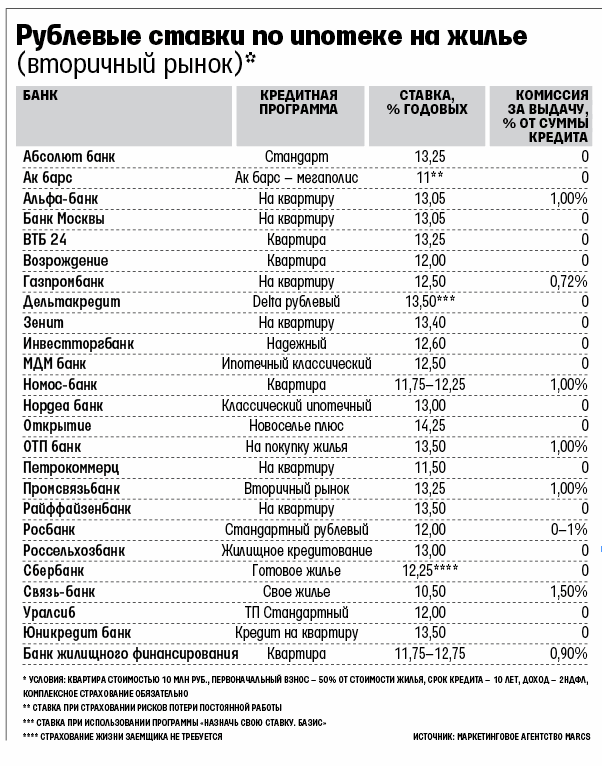 В итоге средняя ставка рублевого кредита в 20 крупнейших ипотечных банках с октября по март выросла почти на 1 п. п. до 12,74% годовых. (Ставки по кредитам на покупку квартир на вторичном рынке см. в таблице.)