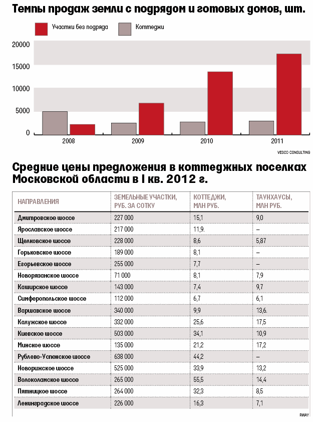 В 2011 г. в проекте «Западная долина» на 21-м км Киевского шоссе продавалось по два участка с подрядом в месяц, рассказывает Иван Потапов. В 2012 г. проходит 3–5 сделок в месяц. «Проекты с подрядом сложно начинать, на старте покупатели относятся к ним с осторожностью», – сожалеет он. Зато разница в стоимости участка с подрядом и готового дома может варьироваться от 30 до 100%, в зависимости от степени готовности всего поселка. По мере того как поселок достраивается, цены в нем повышаются на 30–40%, говорит Наталья Кац, управляющий директор агентства «Усадьба».