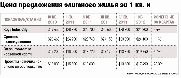 Knight Frank, IntermarkSavills и Ernst & Young в расчете индекса стоимости жилых элитных новостроек Москвы (Keys Index City) учитывают 23 проекта на первичном рынке, по которым застройщиками были полностью сформированы цены и условия продаж. Всего 142 000 кв. м на сумму $2,71 млрд, по данным на 31 марта 2012 г. Но дефицита нет, предложение не сокращается и это защищает рынок от перегрева, уверен Дмитрий Халин, управляющий партнер IntermarkSavills. За 12 месяцев элитные новостройки подорожали, по его оценке, в среднем на 5%.