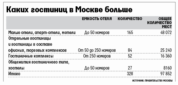 Сейчас в городе всего 328 гостиниц на 97 852 места (данные Москомстройинвеста на 1 марта 2012 г.).