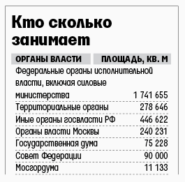 Всего, по словам сотрудника правительства России, в Москве около 210 000 чиновников. По данным НИиПИ генплана, они занимают около 2,884 млн кв. м (см. врез). Затраты на строительство для них новых зданий составят примерно 300 млрд руб., говорится в презентации НИиПИ генплана. Как следует из протокола совещания у первого вице-премьера Игоря Шувалова, помещения власти должны обойтись не дороже 100 000 руб. за 1 кв. м, включая отделку и мебель.