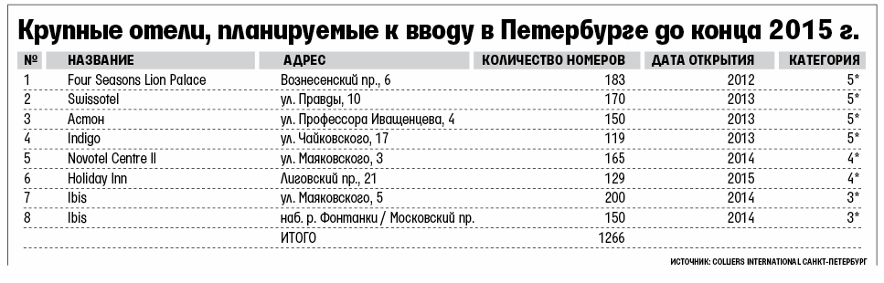 Число гостей Северной столицы увеличивается за счет китайцев, молодежи и командированных из регионов, для них важна цена, говорит отельер Нагач. «Высокие цены на номера не позволяют увеличивать потоки туристов за счет людей со средним доходом, спрос на гостиницы экономкласса и хостелы не удовлетворен», – подтверждает Евгения Тучкова из «Colliers International Санкт-Петербург». По данным гендиректора УК «Кронвелл менеджмент» Алексея Мусакина, самые дешевые отели («2 звезды») сейчас предлагают комнаты от 2500 руб. за ночь. Впрочем, в сегменте «3–4 звезды» расценки (по сравнению с 2011 г.) снизились: с 6850 до 6300 руб. и с 3150 до 3100 руб. соответственно (данные JLL Hotels).
