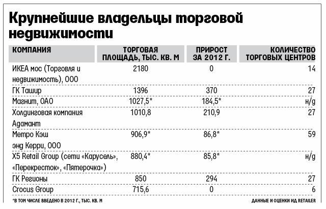 Рэнкинг «Топ-50 крупнейших владельцев торговой недвижимости в 2012 г.» вновь возглавило ООО «ИКЕА мос», владеющее 14 торговыми центрами «Мега», у которого 2,18 млн кв.м торговых площадей. За ним следуют девелоперская группа «Ташир» с 1,4 млн кв.м торговых центров, третий – краснодарский ритейлер «Магнит», у которого, по оценкам ИД Retailer, в собственности будет 1,03 млн кв.м торговой недвижимости на конец года.