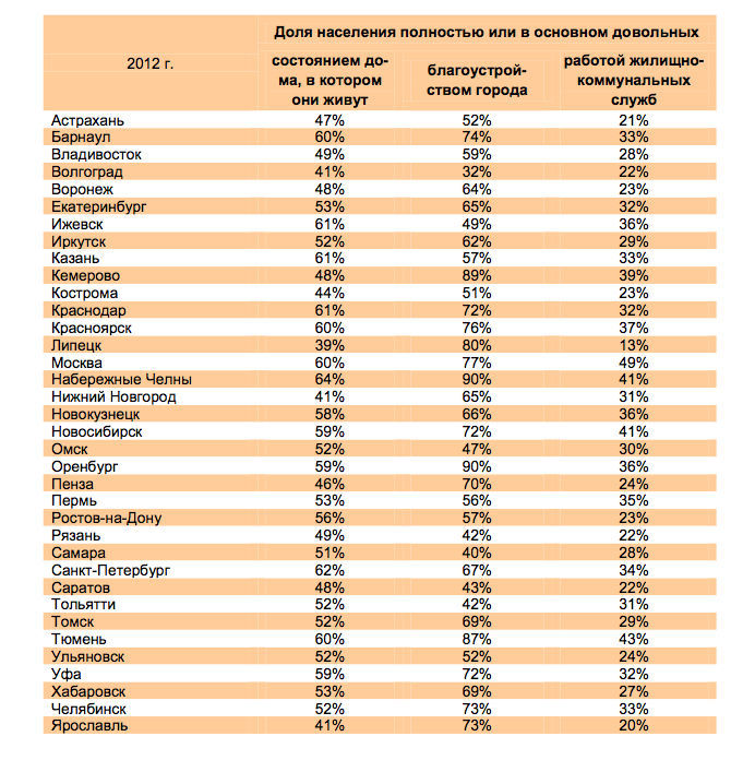 Россиян в массе не устраивает деятельность коммунальных служб. Согласно исследованию, проведенному Центром стратегических исследований Росгосстраха в 36 крупных городах России (в нем приняли участие свыше 11 000 респондентов), лишь 10% граждан полностью довольны работой организаций в сфере ЖКХ. Всего 18% полностью довольны благоустройством своего города. Тех, кого полностью устраивает состояние их дома, больше - 27%. Таковы сводные цифры по всем городам.