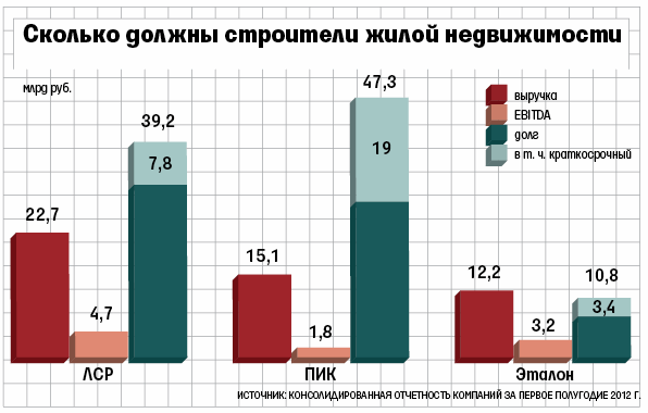 Компания гасит долги за счет продажи квартир, отмечает Мурадов. За девять месяцев 2012 г. «СУ-155» продала 543804 кв. м жилья, получив 27,2 млрд руб. (без учета муниципального жилья). В натуральном выражении это почти в 3 раза больше, чем за аналогичный период прошлого года (192241 кв. м), в деньгах прирост составил лишь 160%. На IV квартал 2012 г. будет приходиться 25–35% от общего объема продаж, прогнозирует представитель компании (итоги еще не подведены). Таким образом, выручка застройщика от продажи квартир в 2012 г. может составить 34–36,72 млрд руб.