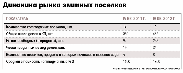 По данным специалистов Knight Frank SPb, в 2012 г. спрос на дорогие дома в составе организованных проектов вырос на 70%. Но в абсолютных цифрах картинка выглядит менее убедительно: в 2011 г. зафиксировано 20 продаж, в 2012 г. – 34.