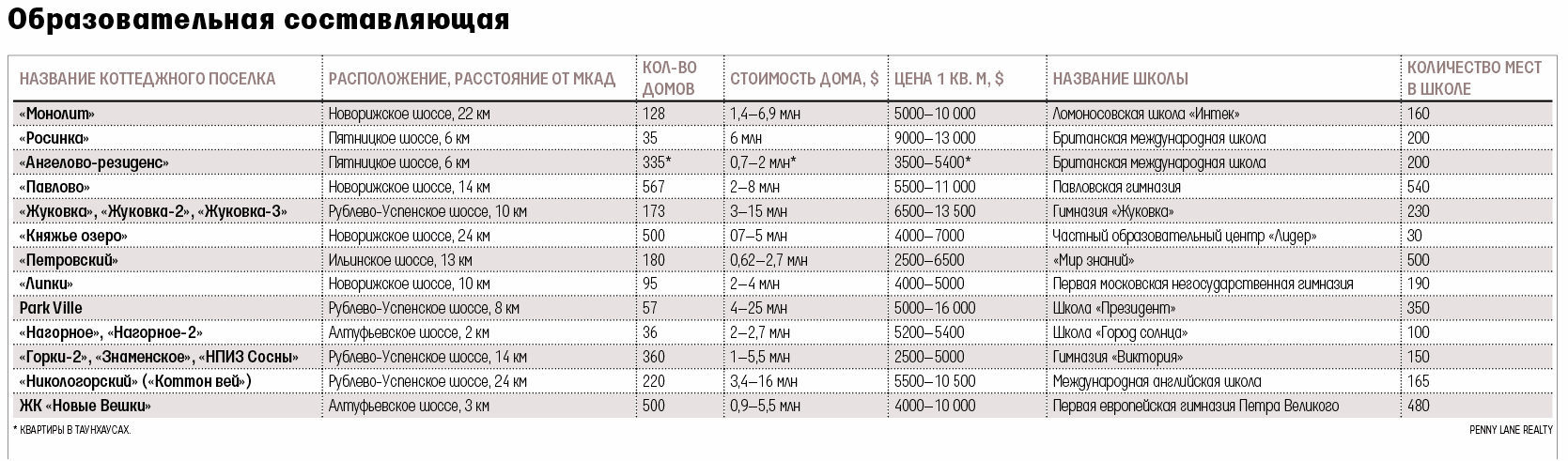 Решившиеся на строительство «поселковую» школу рассматривают как дополнительное маркетинговое преимущество и заинтересованы в том, чтобы образование в ней было, что называется, на уровне. «В Подмосковье обеспечить качественное образование или какие-то индивидуальные программы местными силами тяжело, – объясняет Наталья Картавцева. – Поэтому в случае с загородной недвижимостью речь, конечно же, идет о частных школах».