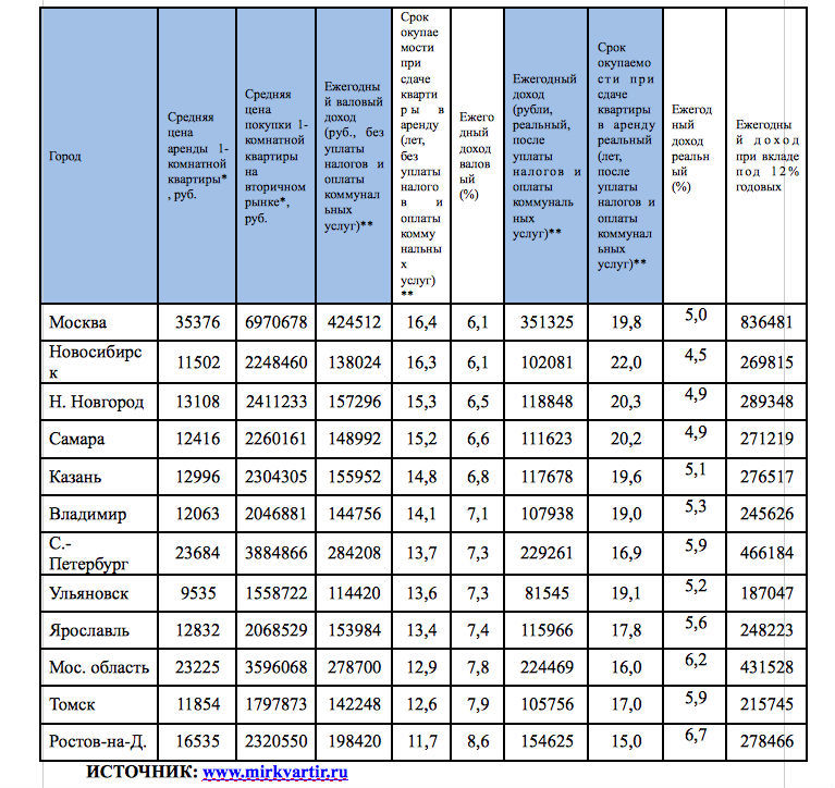 Сравнительная таблица возможных доходов собственников при сдаче 1-комнатной квартиры в аренду в городах России