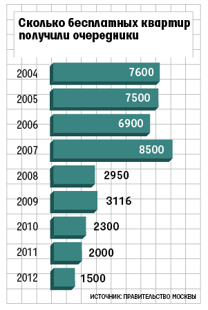 Сейчас в очереди на жилье в Москве стоят 103 383 семьи (345 532 человека). В прошлом году бесплатное жилье получили 1500 семей. Это рекордно мало по сравнению с докризисным периодом (см. рисунок). И больше уже не будет. Согласно московской Адресной инвестиционной программе в 2013–2015 гг. город построит около 1,87 млн кв. м жилья. Из них 1,4 млн кв. м будет направлено на расселение пятиэтажек, ранее рассказывал руководитель стройкомплекса Москвы Марат Хуснуллин. Из этого следует, что очередникам останется 470 000 кв. м за три года. Норма – 18 кв. м на человека, семья в среднем состоит из трех человек, получается, метров хватит примерно на 8700 семей, или по 2900 в год. Построенные городом квартиры распределяются по двум каналам – социальный наем с возможностью приватизации (те самые бесплатные квартиры) и продажа в рассрочку (как правило, ниже рынка в несколько раз). В 2011–2012 гг. в социальный наем было отдано 25–40% квартир. Если исходить из этих пропорций, то в 2013–2015 гг. такое жилье будут получать 725–1160 семей в год.