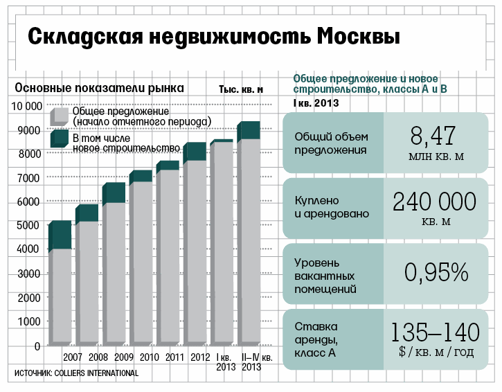 Сейчас в Московском регионе 8,47 млн кв. м складов, но на всех потенциальных арендаторов их не хватает, следует из отчета консалтинговой компании Colliers International. Пустует, по ее подсчетам, менее 1% помещений, а сдается в 1,5 раза больше, чем строится. Так, в I квартале 2013 г. было введено в эксплуатацию 160 000 кв. м складов, а арендовано или продано – около 240 000 кв. м, говорит директор департамента складской и индустриальной недвижимости Colliers International Владислав Рябов. По данным Knight Frank, разрыв еще существеннее: в этом году построили 137 000 кв. м, а сдали в аренду и продали 280 000 кв. м. Jones Lang LaSalle (JLL) оценивает долю свободных помещений в 1,07%. «Практически все введенные в прошедшем квартале площади были сданы или проданы на ранних этапах строительства, поэтому их ввод в эксплуатацию не отразился на объеме свободных помещений», – констатируют аналитики этой консалтинговой компании.