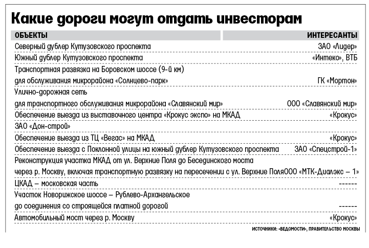 Северный дублер – не единственный дорожный объект, который Москва собирается строить на внебюджетные средства (см. таблицу). Для этих целей мэрия создала дорожный фонд, в который инвесторы могут добровольно перечислять деньги на строительство дорог к собственным проектам. Первая компания – «Мортон» – уже перечислила первый транш в 20 млн руб., ведутся переговоры с инвесторами о перечислении в фонд в общей сложности 2,5 млрд руб.