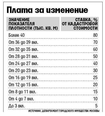 Если, например, кадастровая стоимость участка в 0,36 га промышленного назначения в ЮЗАО равнялась 37,4 млн руб., то после изменения вида на офисно-гостиничное (планируется здание в 9000 кв. м) кадастровая стоимость для собственника увеличится до 130,8 млн руб. Плата за изменение составит 37,4 млн руб.