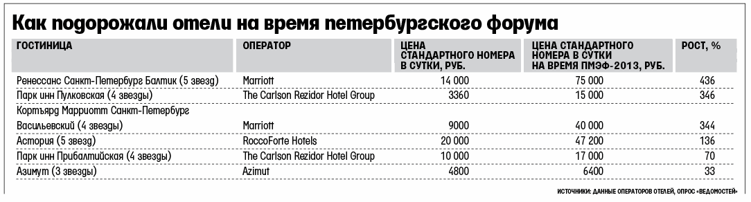 «Ведомости» спросили отельеров, как они повысят цены на стандартный номер в дни форума – 20–22 июня. Разброс получился большой – от 30 до 436% (см. таблицу).