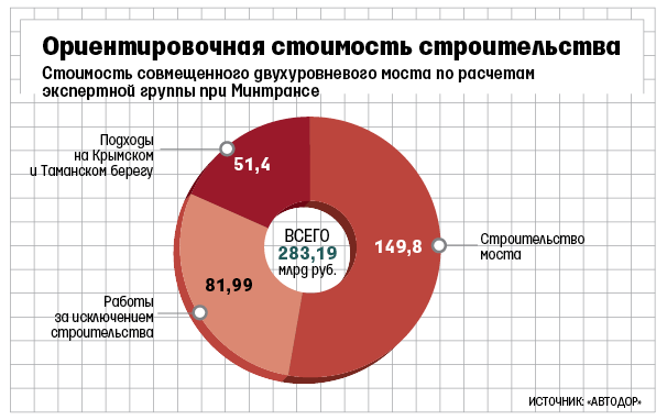 Стоимость моста тоже пока «колеблется», сказал вчера Козак: по его оценкам, от 150 млрд до 200 млрд руб. Оценки экспертного совета при Минтрансе были выше - до 283 млрд руб. в случае строительства двухуровневого совмещенного моста, который пройдет по косе Тузла (см. параметры проекта на графике). К ноябрю должны быть готовы инженерные изыскания и технико-экономическое обоснование - тогда будет определена и стоимость, и модель реализации проекта.