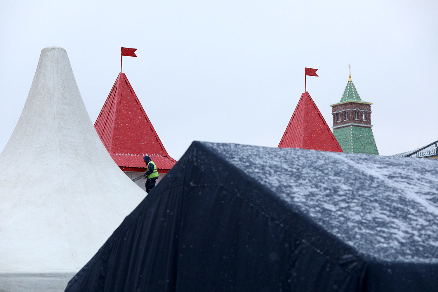 Рабочий во время установки новогодних декораций на Красной площади.