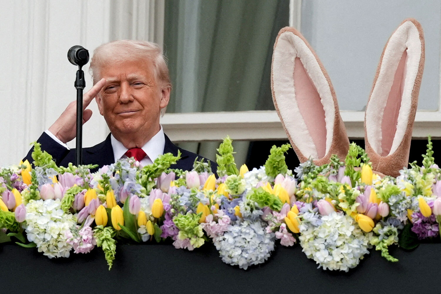 21 апреля 2025 г. Президент США Дональд Трамп приветствует американцев на ежегодном мероприятии по пасхальному катанию яиц в Белом доме в Вашингтоне, США.