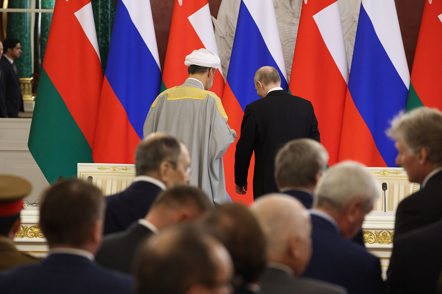 22 апреля 2025 г. Президент России Владимир Путин и султан Омана Хейсам бен Тарек Аль Саид на переговорах в Москве.