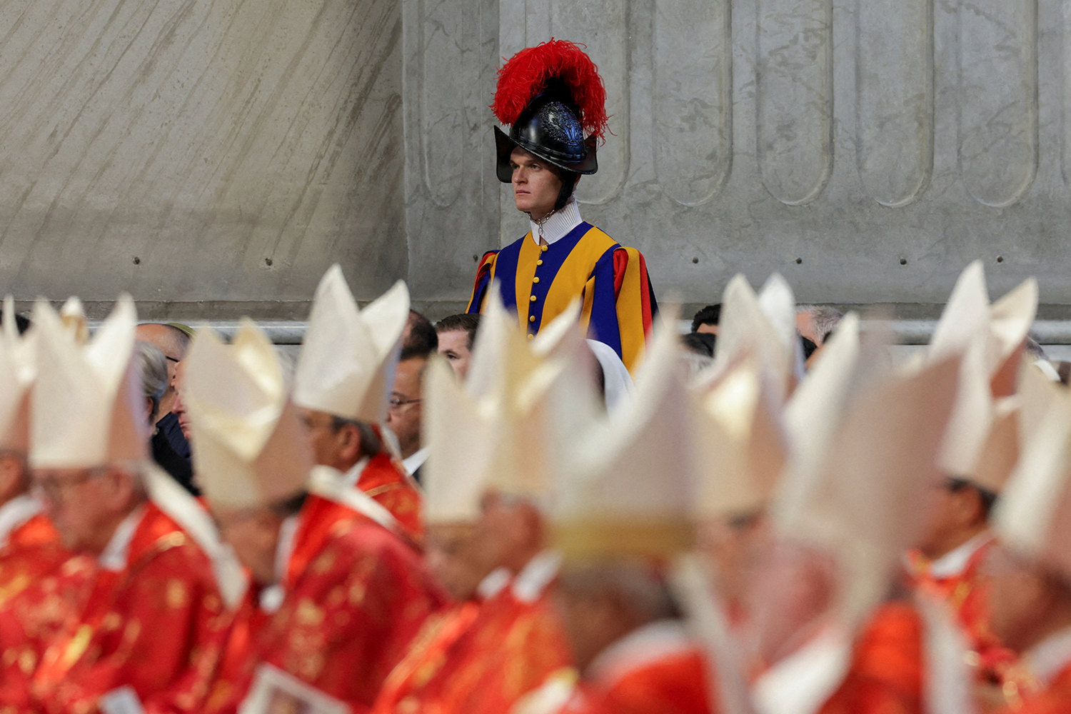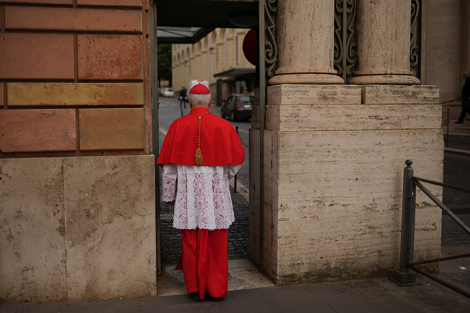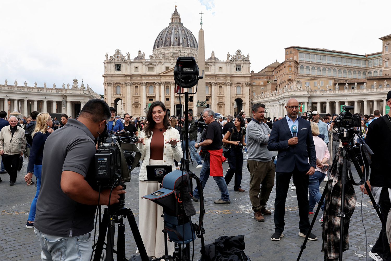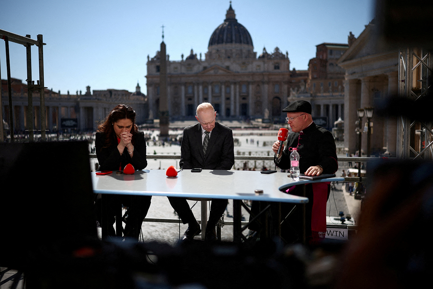 Guglielmo Mangiapane / ReutersМонсе Альварадо, президент и главный операционный директор EWTN News – американской медиакомпании, освещающей новости для католиков по всему миру, Мэтью Бансон, вице-президент и редакционный директор, а также монсеньор Роджер Лэндри молятся во время прямого эфира рядом с площадью Святого Петра.