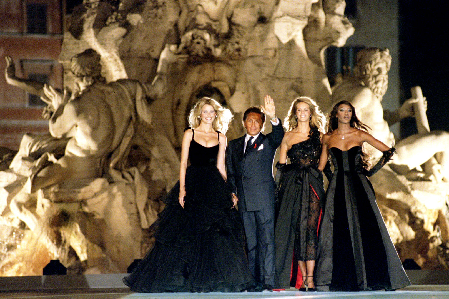 На фото: итальянский модельер Валентино Гаравани и модели Клаудия Шиффер, Элль Макферсон, Наоми Кэмпбелл.
