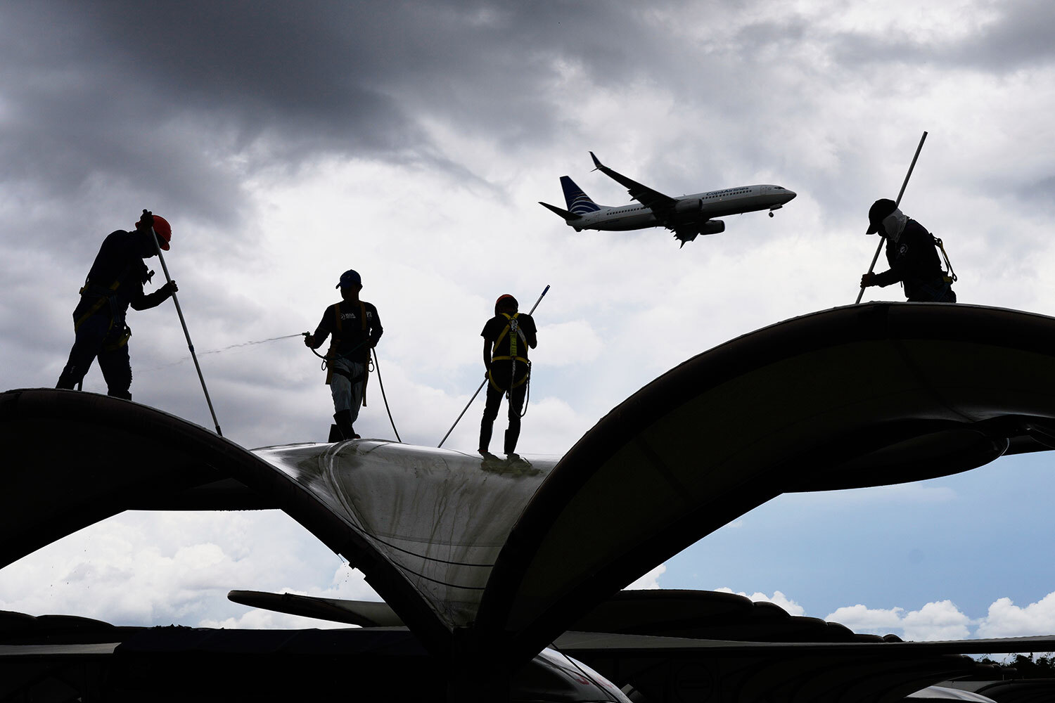 22 мая 2025 г. Рабочие чистят крышу в международном аэропорту Токумен в Панама-сити, Венесуэла.