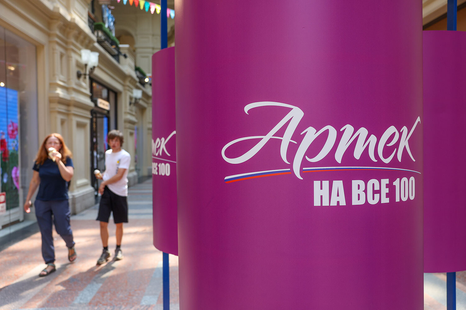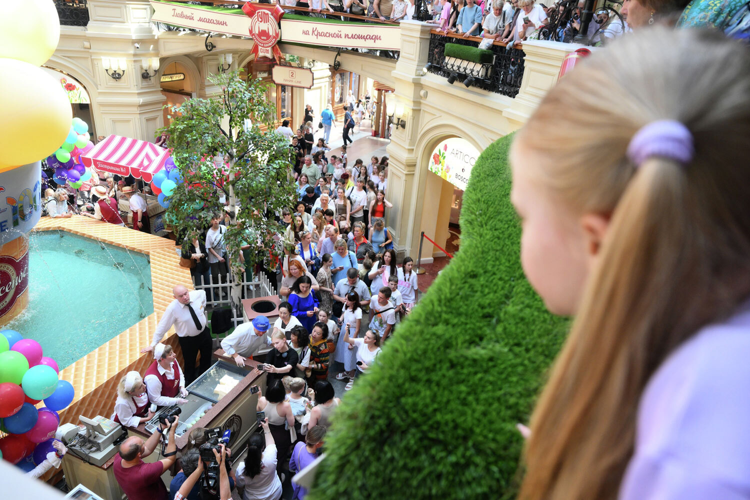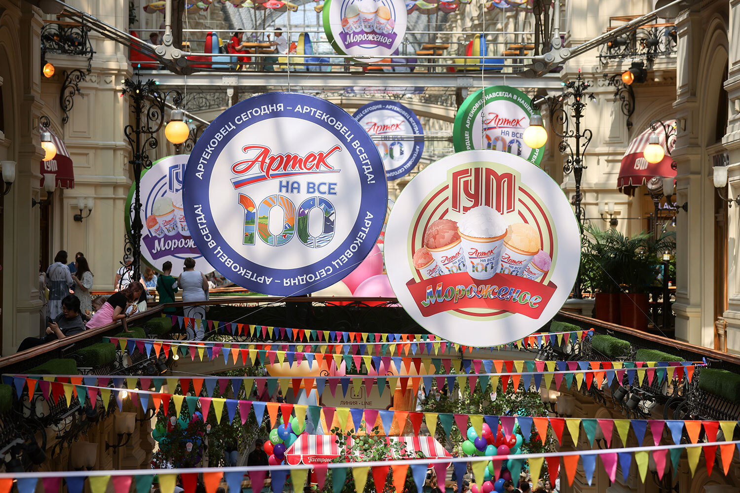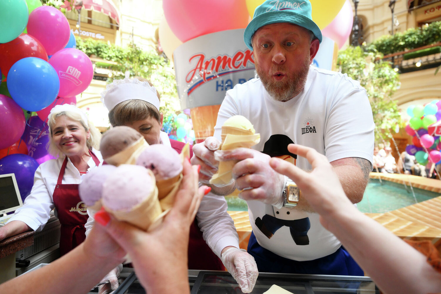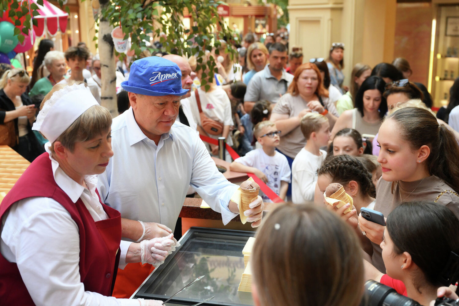 Григорий Сысоев / РИА Новости9 июня в ГУМе в рамках открывшейся выставки «Артек» – на все 100!» прошла акция, посвященная юбилею международного детского центра, а также традиционному Дню мороженого – визитной карточке универмага. В честь праздника артисты угощали посетителей ледяным лакомством. Каждому, кто купил хрустящий стаканчик, в подарок полагалась порция особого артековского пломбира, привезенного из Крыма. В пресс-службе ГУМа отметили, что все средства, вырученные на благотворительном мероприятии, будут направлены в фонд «Наука – детям».