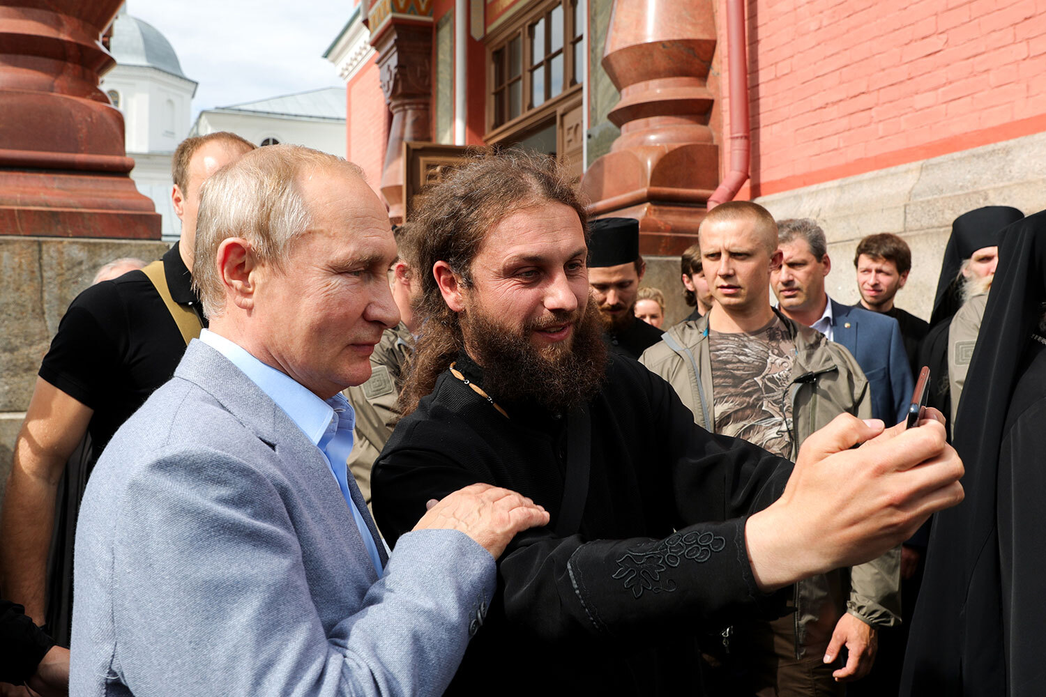 На фото: президент России Владимир Путин фотографируется со священнослужителем во время посещения Спасо-Преображенского Валаамского ставропигиального мужского монастыря, 2019 г.